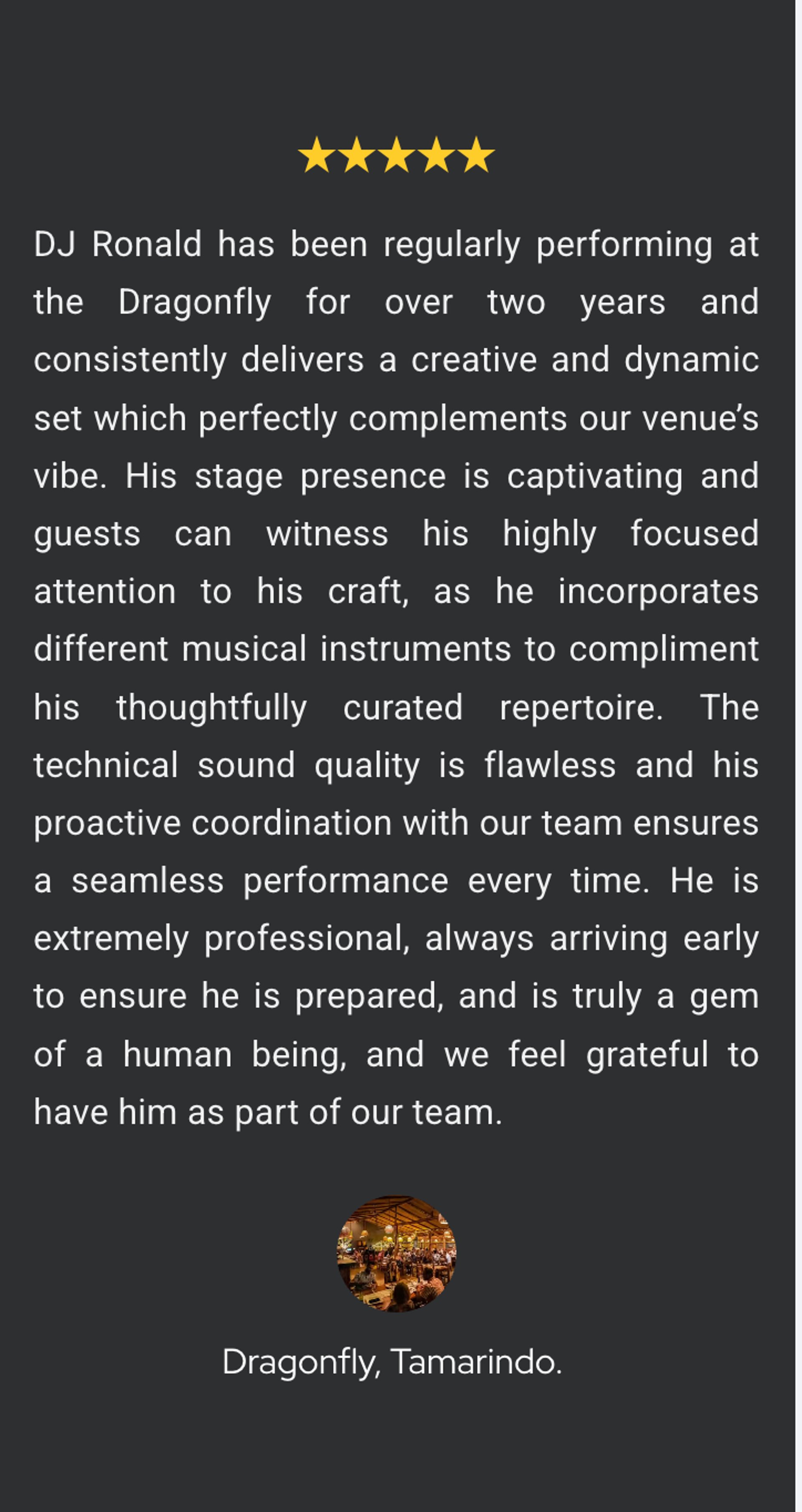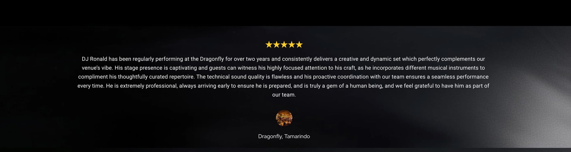 DJ Ronald has been regularly performing at the Dragonfly for over two years and consistently delivers a creative and dynamic set which perfectly complements our venue’s vibe. His stage presence is captivating and guests can witness his highly focused attention to his craft, as he incorporates different musical instruments to compliment his thoughtfully curated repertoire. The technical sound quality is flawless and his proactive coordination with our team ensures a seamless performance every time. He is extremely professional, always arriving early to ensure he is prepared, and is truly a gem of a human being, and we feel grateful to have him as part of our team.