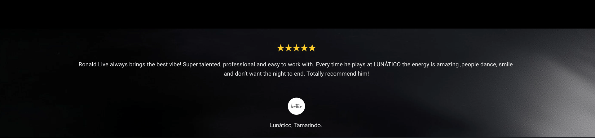 Ronald Live always brings the best vibe! Super talented, professional and easy to work with. Every time he plays at LUNÁTICO the energy is amazing ,people dance, smile and don’t want the night to end. Totally recommend him!