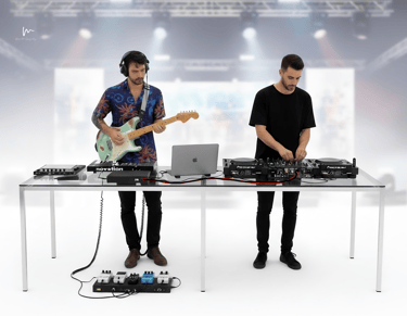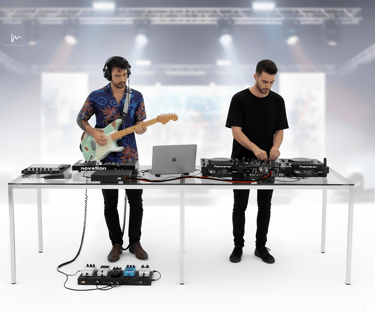En clubes y festivales, mi propuesta se transforma en una experiencia vibrante y dinámica: los instrumentos en vivo se combinan con beats electrónicos para generar una atmósfera única, creativa y cargada de energía, perfecta para bailar y disfrutar de un auténtico show de música electrónica en vivo.