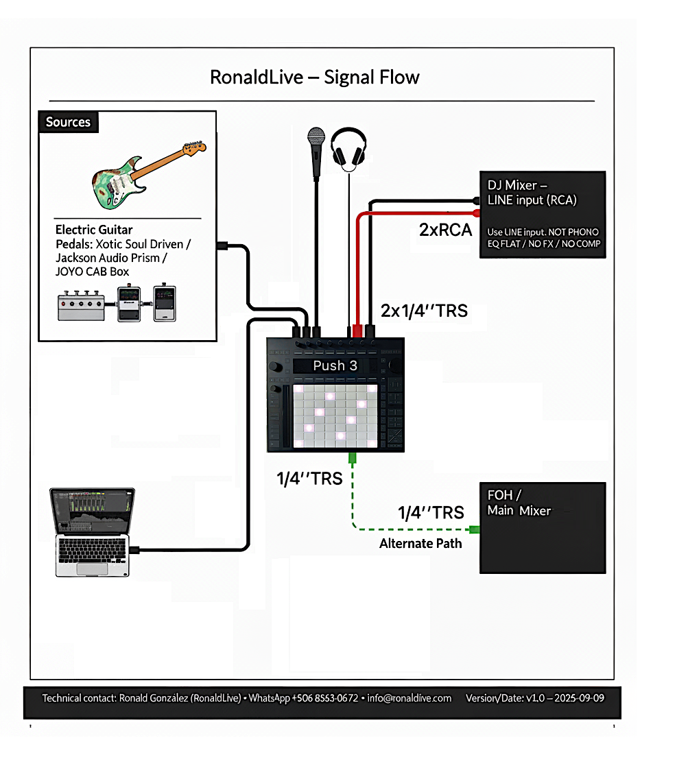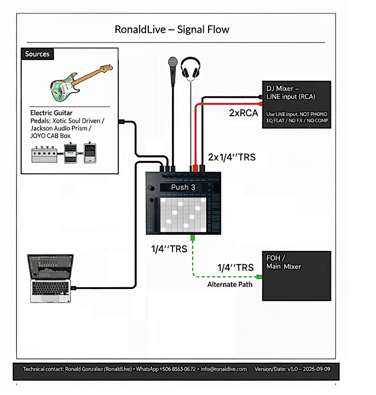 Artista: RonaldLive — Live set electrónico (Ableton + guitarra Percusión + voz). Formatos: Solo o con DJ (roles definidos). Canales de audio requeridos: 2 × LINE RCA en mixer DJ (conexión prevista 2×1/4” TS→2×RCA Y. Mixer DJ: estándar (Pioneer/A&H/Denon) con 1 canal LINE libre (no phono; pan al centro o L/R duplicado). Monitoreo: monitor de cabina DJ existente. Espacio: cabina DJ; ~1,0 m de ancho × 0,6 m de fondo libres; sin mesa extra. Energía: regleta (≥6 tomas, con tierra) a ≤1 m + extensión dedicada; UPS/AVR 1000–1500 VA . Backline: ninguno. Soportes: 1 boom mic stand; 1 soporte de guitarra (opcional). Tiempos: montaje ~2 h 30 min; line check ~5 min; desmontaje ~1 h. Alternativa (sin mixer DJ): envío a mixer principal del venue (1 canal LINE libre) vía 1/4” TRS↔TRS o 1/4” TRS→XLR desde cabina. Contacto técnico: Ronald González · +506 8363-0672 · info@ronaldlive.com · ronaldlive.com